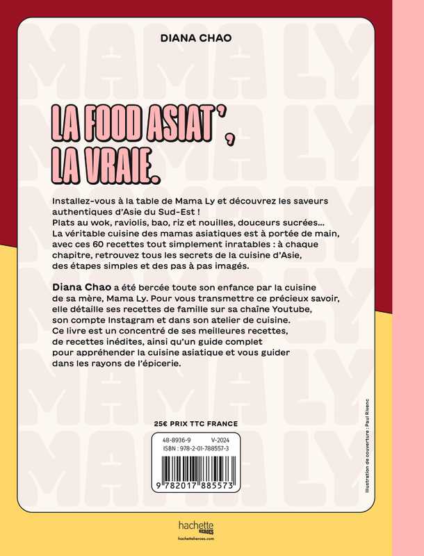 Diana Chao a été bercée toute son enfance par la cuisine de sa mère, Mama Ly. Pour vous transmettre ce précieux savoir, elle détaille ses recettes de famille sur sa chaîne Youtube, son compte Instagram et dans son atelier de cuisine. Ce livre est un concentré de ses meilleures recettes, de recettes inédites, ainsi qu’un guide complet pour appréhender la cuisine asiatique et vous guider dans les rayons de l’épicerie.