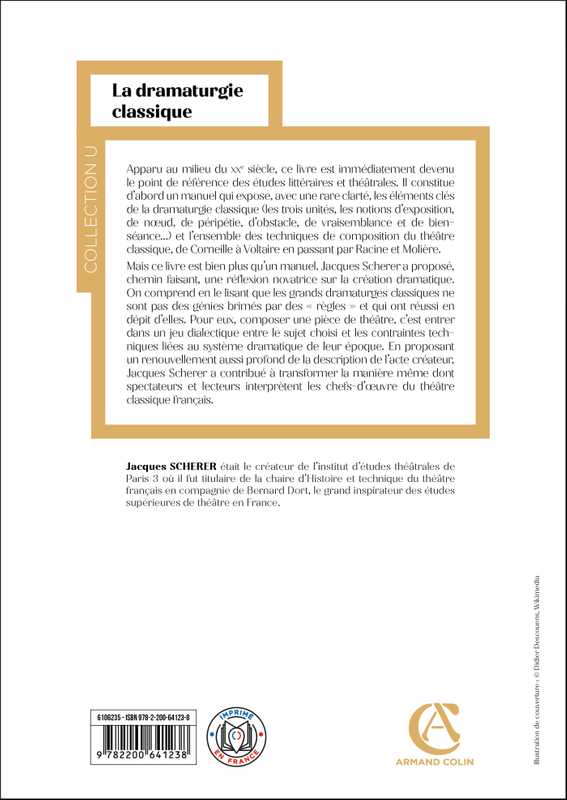 Apparu au milieu du XXe siècle, ce livre est immédiatement devenu le point de référence des études littéraires et théâtrales. Il constitue d’abord un manuel qui expose, avec une rare clarté, les éléments clés de la dramaturgie classique (les trois unités, les notions d’exposition, de nœud, de péripétie, d’obstacle, de vraisemblance et de bienséance...) et l’ensemble des techniques de composition du théâtre classique, de Corneille à Voltaire en passant par Racine et Molière.