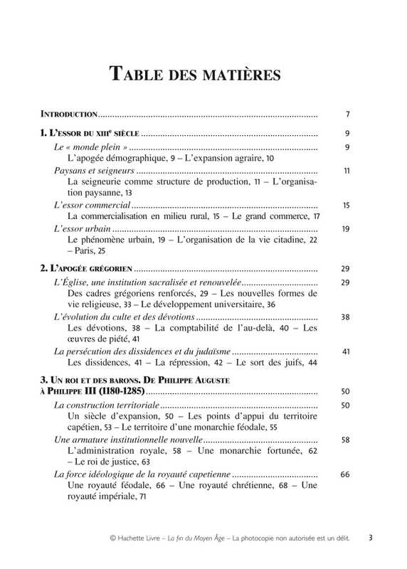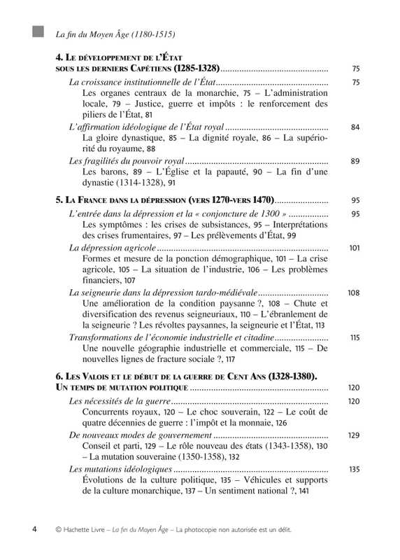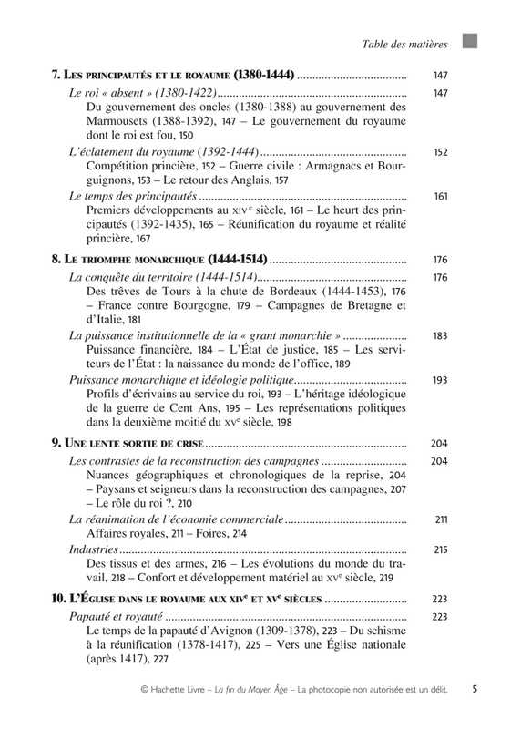 L'ouvrage aborde aussi bien les transformations de l'exercice du pouvoir que l’évolution économique et sociale et les changements dévotionnels qui caractérisent le second Moyen Âge en France. Sans négliger aucun des thèmes dont l'étude a été renouvelée par la recherche la plus récente, il adopte une présentation chronologique qui rend sa lecture aisée.