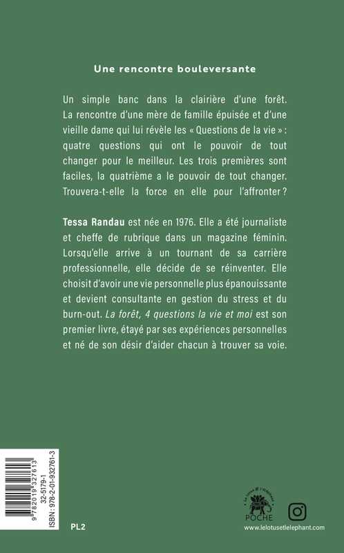Un simple banc dans la clairière d’une forêt. La rencontre d’une mère de famille épuisée et d’une vieille dame qui lui révèle les « Questions de la vie » : quatre questions qui ont le pouvoir de tout changer pour le meilleur. Les trois premières sont