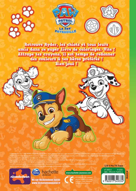 Venez retrouver Chase, Stella, Marcus et tous leurs amis de la Pat' Patrouille dans ce grand livre de coloriages à petit prix !