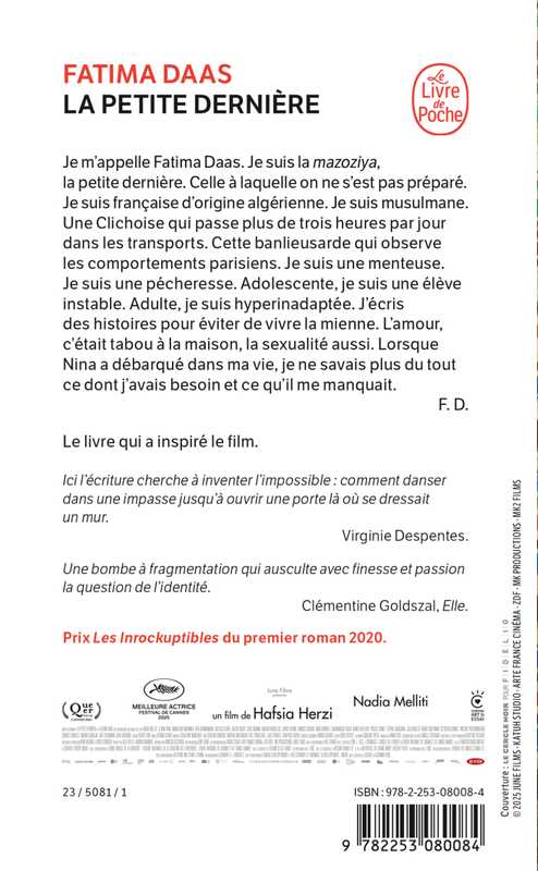 « Je m'appelle Fatima Daas. Je suis la mazoziya, la dernière. Celle à laquelle on ne s'est pas préparé. Française d'origine algérienne. Je suis musulmane. Une Clichoise qui passe plus de trois heures par jour dans les transports. Cette banlieusarde qui observe les comportements parisiens. Je suis une menteuse, une pécheresse. Adolescente, je suis une élève instable. Adulte, je suis hyperinadaptée. J'écris des histoires pour éviter de vivre la mienne. L'amour, c'était tabou à la maison, la sexualité aussi. Lorsque Nina a débarqué dans ma vie, je ne savais plus du tout ce dont j'avais besoin et ce qu'il me manquait. »