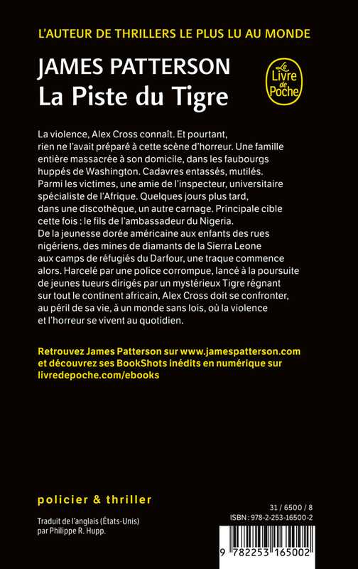La violence, Alex Cross connaît. Et pourtant, rien ne l’avait préparé à cette scène d’horreur. Une famille entière massacrée à son domicile, dans les faubourgs huppés de Washington. Cadavres entassés, mutilés. Parmi les victimes, une amie de l’inspecteur, universitaire spécialiste de l’Afrique. Quelques jours plus tard, dans une discothèque, un autre carnage. Principale cible cette fois : le fils de l’ambassadeur du Nigeria. Une traque commence alors pour l’inspecteur et son équipe, de la jeunesse dorée américaine aux enfants des rues nigériens, des mines de diamants de la Sierra Leone aux camps de réfugiés du Darfour. Harcelé par une police corrompue, lancé à la poursuite de jeunes tueurs dirigés par un mystérieux Tigre régnant sur tout le continent africain, Alex Cross doit se confronter, au péril de sa vie, à un monde sans lois, où la violence et l’horreur se vivent au quotidien.