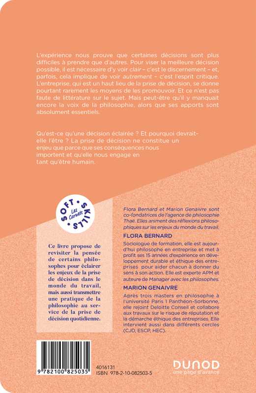 Ce livre propose de revisiter la pensée de certains philosophes pour éclairer les enjeux de la prise de décision dans le monde du travail, mais aussi transmettre une pratique de la philosophie au service de la prise de décision quotidienne.