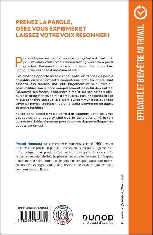 Cet ouvrage apporte un éclairage inédit sur la prise de parole en public, en associant cette compétence redoutée et pourtant essentielle au modèle DISC, outil largement utilisé aujourd’hui pour évaluer son propre comportement et celui des autres Découvrir ses forces, apprendre à maîtriser ses côtés « obscurs » et identifier les points à améliorer… Mieux se connaître et mieux connaître son public, c’est mieux communiquer, que vous soyez un novice tremblant ou un orateur chevronné en quête de nouvelles idées.