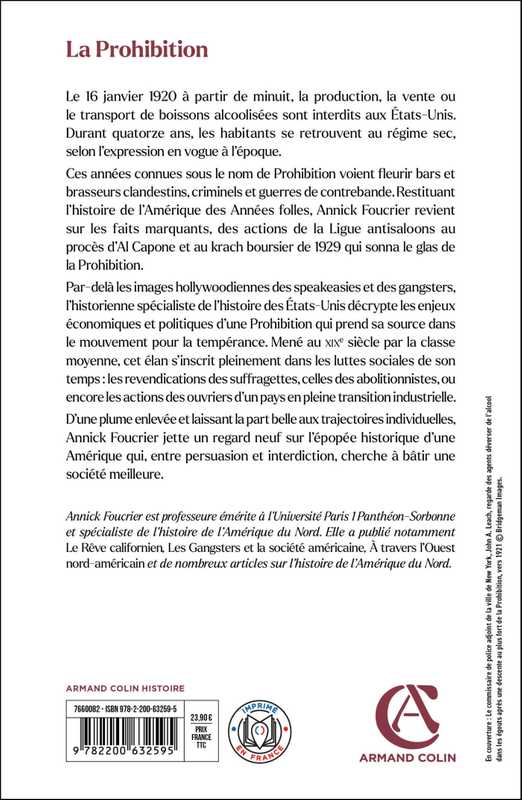Ces années connues sous le nom de Prohibition voient fleurir bars et brasseurs clandestins, criminels et guerres de contrebande. Restituant l’histoire de l’Amérique des Années folles, Annick Foucrier revient sur les faits marquants, des actions de la Ligue antisaloons au procès d’Al Capone pour « non-paiement de ses impôts » et au krach boursier de 1929 qui sonna le glas de la Prohibition.