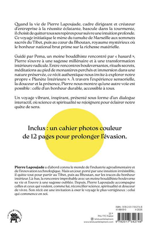 Quand la vie de Pierre Lapoujade, cadre dirigeant et créateur d’entreprise à la réussite éclatante, bascule dans la tourmente, il choisit de quitter tous ses repères pour suivre une intuition profonde. Ce voyage initiatique le mène du tumulte de Marseille aux sommets sacrés du Tibet, puis au cœur du Bhoutan, royaume mystérieux où le bonheur national brut prime sur la richesse matérielle.