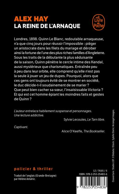 Londres, 1898. Quinn Le Blanc, redoutable arnaqueuse, n’a que cinq jours pour réussir l’impossible : piéger un aristocrate dans les filets du mariage et dérober ainsi la fortune de l’une des plus riches familles d’Angleterre. Sous les traits de la débutante la plus séduisante de la Saison, Quinn pénètre le cercle intime de la famille Kendal, aussi mystérieuse que charismatique. Entraînée peu à peu dans leur orbite, elle comprend qu’elle n’est pas la seule à jouer un jeu de dupes. Pourquoi, alors que les Kendal ont toujours évité de se montrer en société, le duc décide-t-il soudainement de se marier ? Que peut bien cacher sa sœur, l’insaisissable Victoria ? Et qui est cet homme qui observe les moindres faits et gestes de Quinn ?