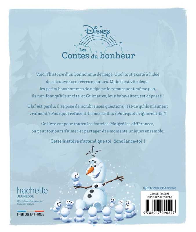 Résumé : Voici l’histoire d’un bonhomme de neige, Olaf, tout excité à l’idée de retrouver ses frères et sœurs. Mais il déchante vite en les rejoignant : les petits bonshommes de neige ne le remarquent pas, ils n’en font qu’à leur tête, et Guimauve, leur baby-sitter, est dépassé!
