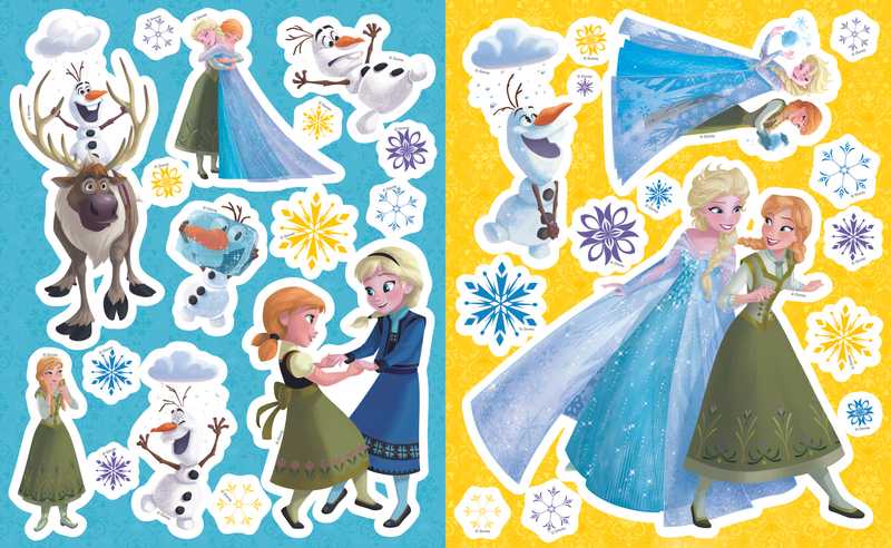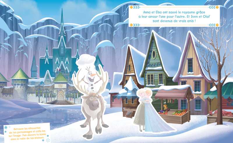 11 scènes des histoires de la Reine des Neiges à compléter avec les stickers d’Elsa, d’Olaf et de leurs amis, avec une position bien identifiées sur les pages grâce aux silhouettes transparentes.