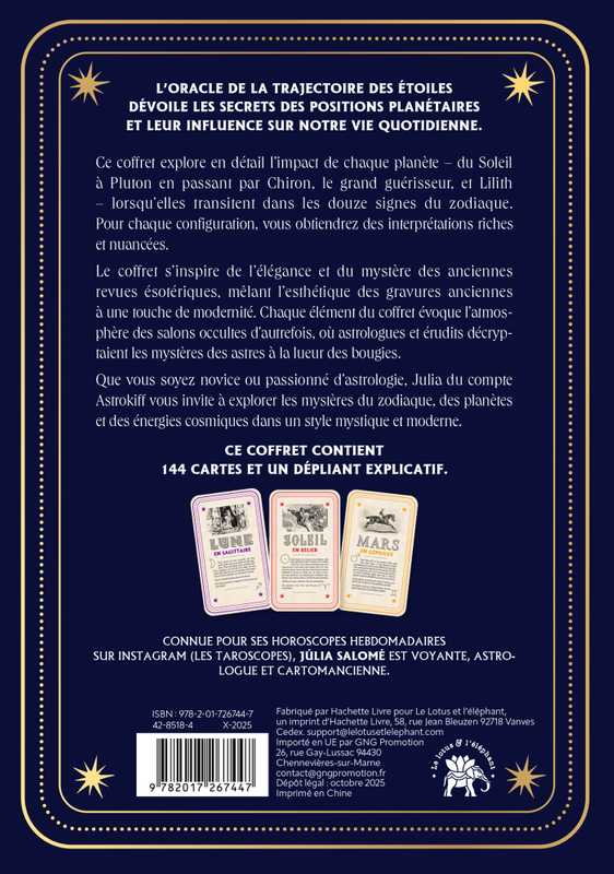 Le coffret s’inspire de l’élégance et du mystère des anciennes revues ésotériques, mêlant l’esthétique des gravures anciennes à une touche de modernité. Chaque élément du coffret évoque l’atmosphère des salons occultes d’autrefois, où astrologues et érudits décryptaient les mystères des astres à la lueur des bougies.