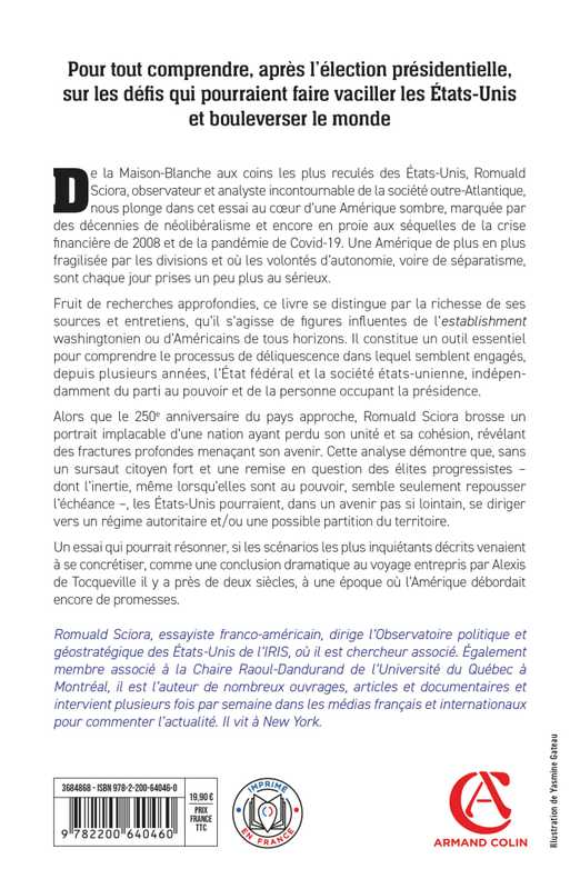 De la Maison-Blanche aux coins les plus reculés des États-Unis, Romuald Sciora, observateur et analyste incontournable de la société outre-Atlantique, nous plonge dans cet essai au cœur d’une Amérique sombre, marquée par des décennies de néolibéralisme et encore en proie aux séquelles de la crise financière de 2008 et de la pandémie de Covid-19. Une Amérique de plus en plus fragilisée par les divisions et où les volontés d’autonomie, voire de séparatisme, sont chaque jour prises un peu plus au sérieux.