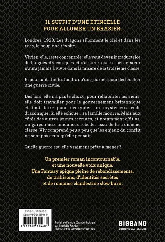 Dès lors, elle n'a pas le choix : pour réhabiliter les siens, elle doit travailler pour le gouvernement britannique et tout faire pour décrypter un mystérieux code draconique. Si elle échoue... sa famille mourra. Mais aux côtés des autres jeunes recrutés, et notamment d'Atlas, un garçon aux tendances rebelles issu de la troisième classe, Viv comprend peu à peu que les enjeux du conflit ne sont pas ceux qu'elle pensait.
