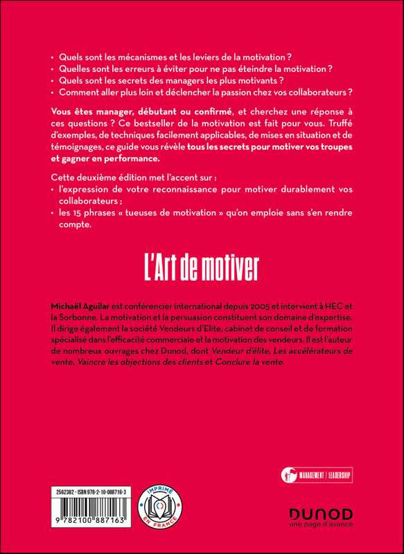 Michaël Aguilar est conférencier international depuis 2005 et intervient à HEC et la Sorbonne. La motivation et la persuasion constituent son domaine d’expertise. Il dirige également la société Vendeurs d’Elite, cabinet de conseil et de formation spécialisé dans l’efficacité commerciale et la motivation des vendeurs. Il est l’auteur