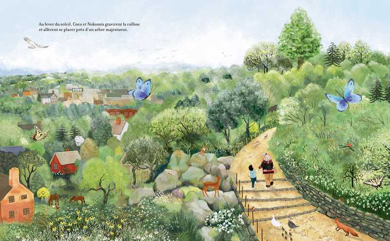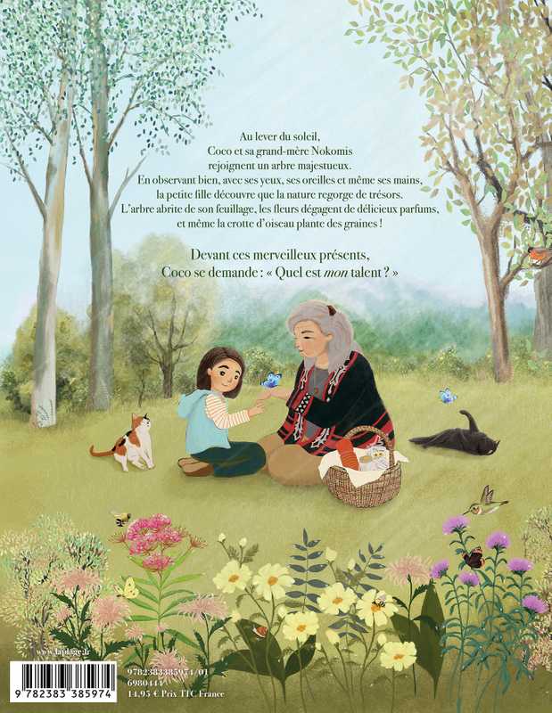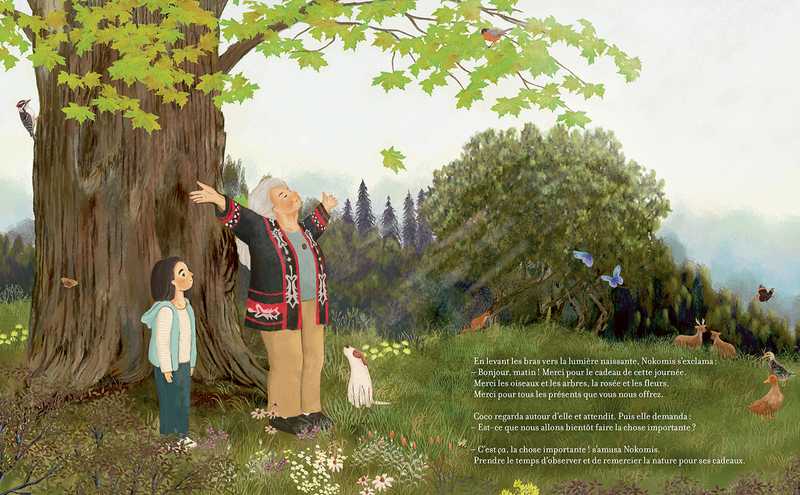 Au lever du soleil, Coco et sa grand-mère Nokomis rejoignent un arbre majestueux. En observant bien, avec ses yeux, ses oreilles et même ses mains, la petite fille découvre que la nature regorge de trésors. L'arbre abrite de son feuillage, les fleurs dégagent de délicieux parfums, et même la crotte d'oiseau plante des graines !