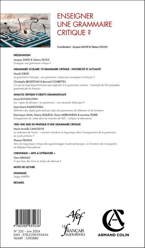 La revue Le français aujourd'hui constitue un outil de réflexion et d'actualisation des connaissances sur le fonctionnement de la langue et des discours, sur un auteur ou une approche littéraire, sur des démarches d'enseignement-apprentissage novatrices. Chaque numéro regroupe, autour d'une thématique, des contributions qui s'appuient sur les données des recherches en sciences humaines, et plus particulièrement en sciences du langage et en didactique des langues et des textes, ainsi que sur des expériences concrètes, menées dans les différentes classes où le français est enseigné ou utilisé.