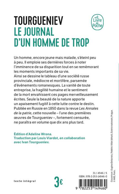 Le journal d'un homme de trop appartient aux premières oeuvres de Tourgueniev. Publiée en Russie en 1850 dans la revue Les Annales de la patrie, cette nouvelle ne paraîtra en volume que dix ans plus tard, fortement censurée. Un homme, encore jeune et malade, s'éteint peu à peu. Il emploie ses dernières forces à noter l'imminence de sa disparition tout en se remémorant les moments importants de sa vie. Ainsi se dessine le tableau d'une société russe provinciale, médiocre et mortifère, parsemée d'événements romanesques, tels qu'un amour contrarié, un bal ou un duel. La vanité de toute entreprise, la fragilité humaine et le sentiment de la mort envahissent ces pages merveilleusement écrites. Seul le sentiment de la nature apporte un apaisement fugitif à cette lutte contre l'inéluctabilité du destin. Paru en France dès 1863, salué par les plus grands écrivains de l'époque, Le journal d'un homme de trop connut un vif succès.
