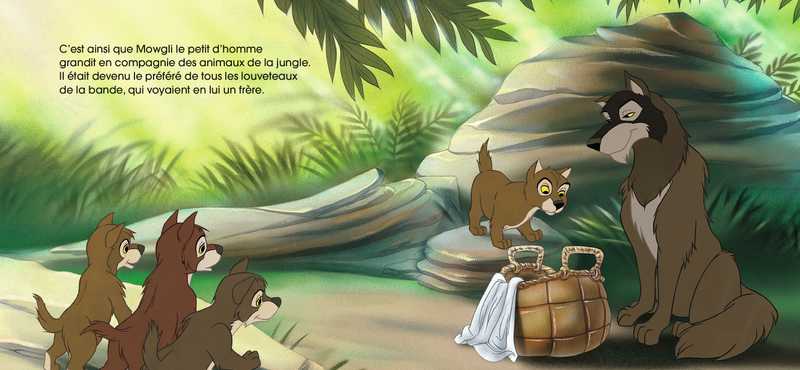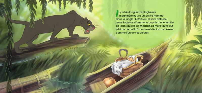 – Un petit album illustré de 48 pages, de la taille d’un boitier CD, pour découvrir les aventures de Mowgli.