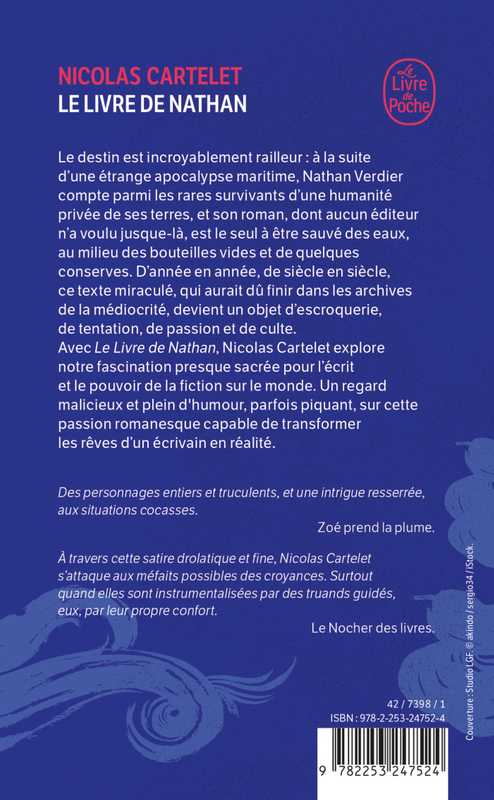 Le destin est incroyablement railleur : à la suite d’une étrange apocalypse maritime, Nathan Verdier compte parmi les rares survivants d’une humanité privée de ses terres, et son roman, dont aucun éditeur n’a voulu jusque-là, est le seul à être sauvé des eaux, au milieu des bouteilles vides et de quelques conserves. D’année en année, de siècle en siècle, ce texte miraculé, qui aurait dû finir dans les archives de la médiocrité, devient un objet d’escroquerie, de tentation, de passion et de culte.