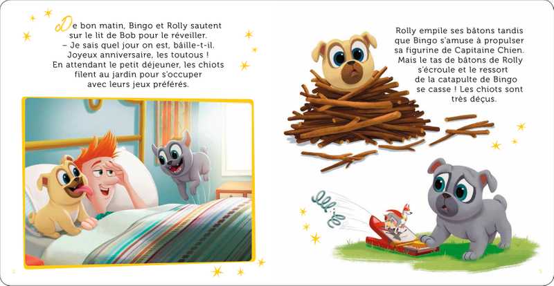 Dans cet ouvrage de 16 pages richement illustré, aux textes courts, faciles et rapides à lire, découvrez une nouvelle histoire du Monde de Bingo et Rolly, en marge de la série animée Disney Junior. Un texte adapté aux plus petits pour un temps de lecture de 5 minutes.