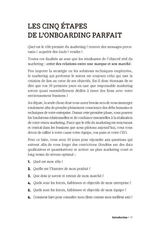 Réussir ses trente premiers jours en tant que responsable marketing est un travail de longue haleine qui s’apparente à un trail. À défaut de vous apprendre à courir, ce livre vous explique comment capitaliser sur les bonnes ressources pour construire les fondamentaux de votre vision marketing tout en maximisant votre impact le plus rapidement possible.
