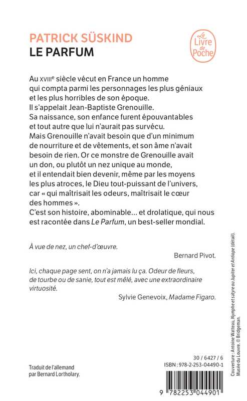 Au XVIIIe siècle vécut en France un homme qui compta parmi les personnages les plus géniaux et les plus horribles de son époque. Il s'appelait Jean-Baptiste Grenouille. Sa naissance, son enfance furent épouvantables et tout autre que lui n'aurait pas survécu. Mais Grenouille n'avait besoin que d'un minimum de nourriture et de vêtements, et son âme n'avait besoin de rien.