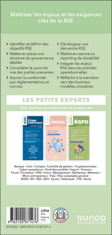 En 48 pages et 16 fiches pratiques, Le petit RSE fournit toutes les notions indispensables pour appliquer la RSE dans toute entreprise et de tout secteur. Cet ouvrage donne ainsi les repères utiles pour transformer les business models actuels au regard des enjeux de la RSE :