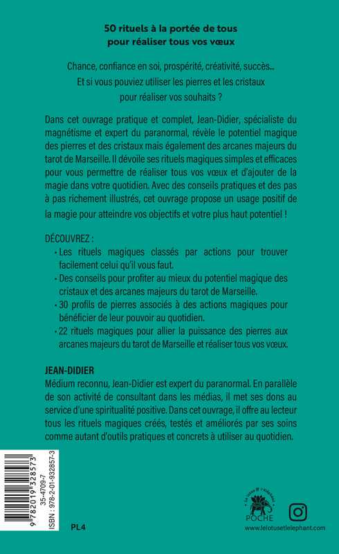 Dans cet ouvrage pratique et complet, Jean-Didier, spécialiste du magnétisme et expert du paranormal, révèle le potentiel magique des pierres et des cristaux mais également des arcanes majeurs du tarot de Marseille. Il dévoile ses rituels magiques simples et efficaces pour vous permettre de réaliser tous vos voeux et d’ajouter de la magie dans votre quotidien. Avec des conseils pratiques et des pas
