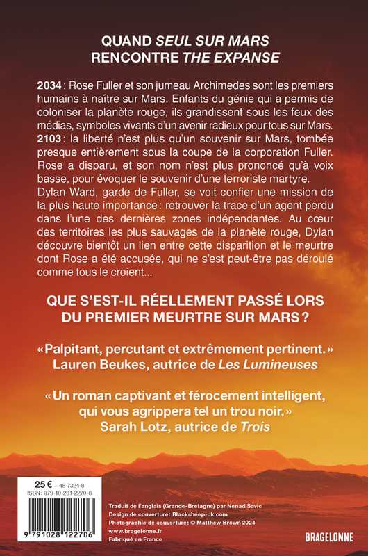 « Cette virée en rover martien sur la planète rouge est à la fois exaltante et une réflexion profonde sur la construction, l'emprisonnement et la libération de la société. La science est rigoureusement précise, l'intrigue déborde de créativité et les péripéties s'enchaînent à la vitesse de la lumière. J'ai adoré ce roman. » Sam Beckbessinger, co-autrice de Girls of Little Hope