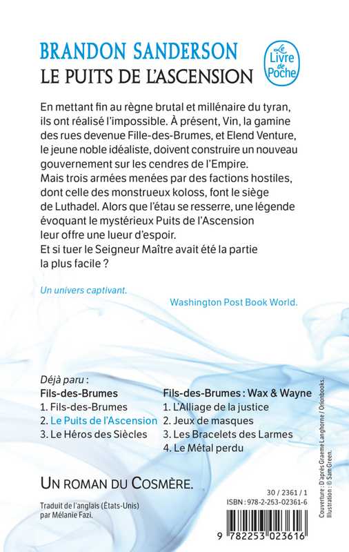 En mettant fin au règne brutal et millénaire du tyran, ils ont réalisé l’impossible. À présent, Vin la gamine des rues devenue Fille-des-Brumes, et Elend Venture le jeune noble idéaliste, doivent construire un nouveau gouvernement sur les cendres de l’Empire. Mais trois armées menées par des factions hostiles, dont celle des monstrueux koloss, font le siège de Luthadel. Alors que l’étau se resserre, une légende évoquant le mystérieux Puits de l’Ascension leur offre une lueur d’espoir. Et si tuer le Seigneur Maître avait été la partie la plus facile ?