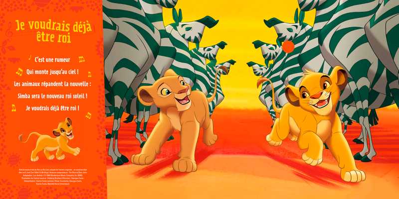 Sur chaque page, l'enfant recherche dans l'illustration le petit bouton qui déclenchera la chanson. Une illustration simple et tendre accompagne chaque chanson mythique de Le Roi Lion et invite à découvrir l'univers magique du film. En écoutant ou en chantant, l’enfant peut observer les détails de l'image tout en étant autonome.