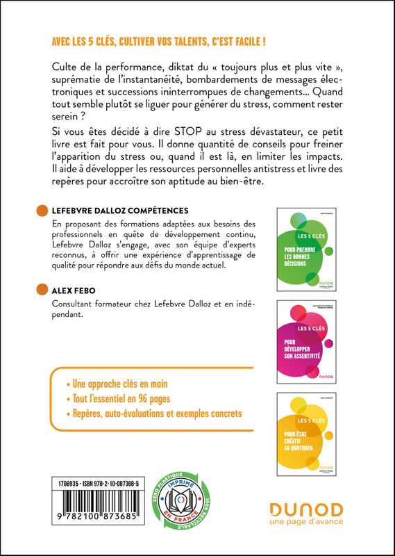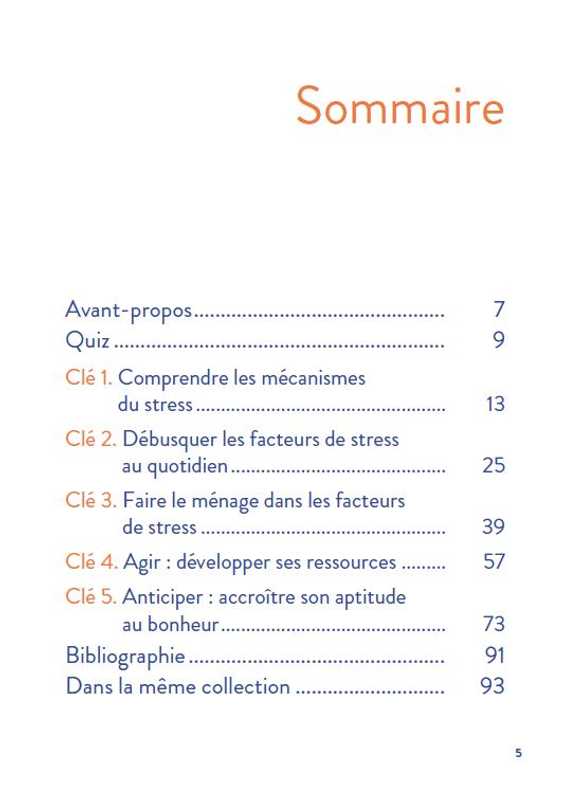 Si vous êtes décidé à dire STOP au stress dévastateur, ce petit livre est fait pour vous. Il donne quantité de conseils pour freiner l’apparition du stress ou, quand il est là, en limiter les impacts. Il aide à développer les ressources personnelles antistress et livre des repères pour accroître son aptitude au bien-être.