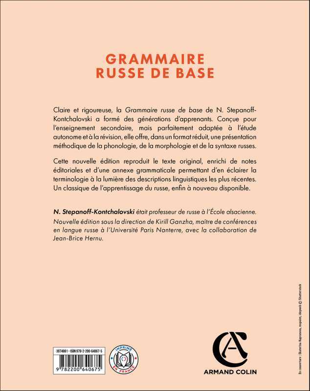 Claire et rigoureuse, la Grammaire russe de base de Natalie Stepanoff-Kontchalovski a formé des générations d’apprenants. Conçue pour l’enseignement secondaire, mais parfaitement adaptée à l’étude autonome et à la révision, elle offre, dans un format réduit, une présentation méthodique de la phonologie, de la morphologie et de la syntaxe russes.