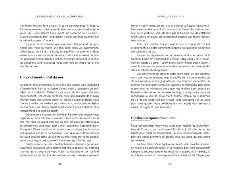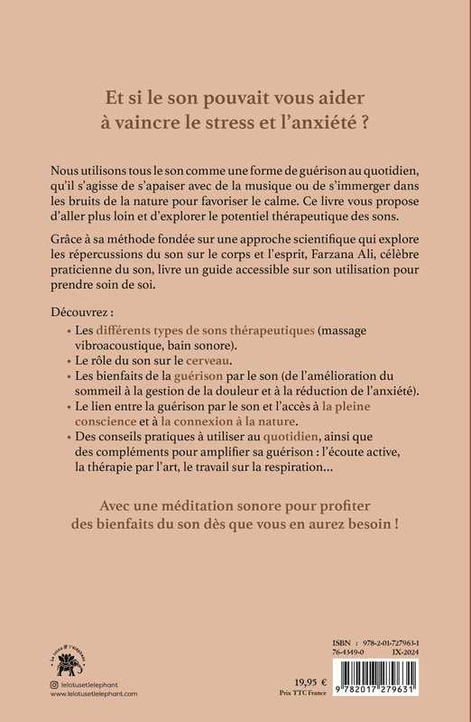 Nous utilisons tous le son comme une forme de guérison au quotidien, qu’il s’agisse de s’apaiser avec de la musique ou de s’immerger dans les bruits de la nature pour favoriser le calme. Ce livre vous propose d’aller plus loin et d’explorer le potentiel thérapeutique des sons.Grâce à sa méthode fondée sur une approche scientifique qui explore les répercussions du son sur le corps et l’esprit, Farzana Ali, célèbre praticienne du son, livre un guide accessible sur son utilisation pour prendre soin de soi.