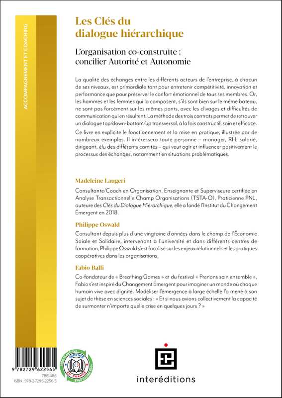 Ce livre en explicite le fonctionnement et la mise en pratique, illustrée par de nombreux exemples. Il intéressera toute personne – manager, RH, salarié, dirigeant, élu des différents comités – qui veut agir et influencer positivement le processus des échanges, notamment en situations problématiques.
