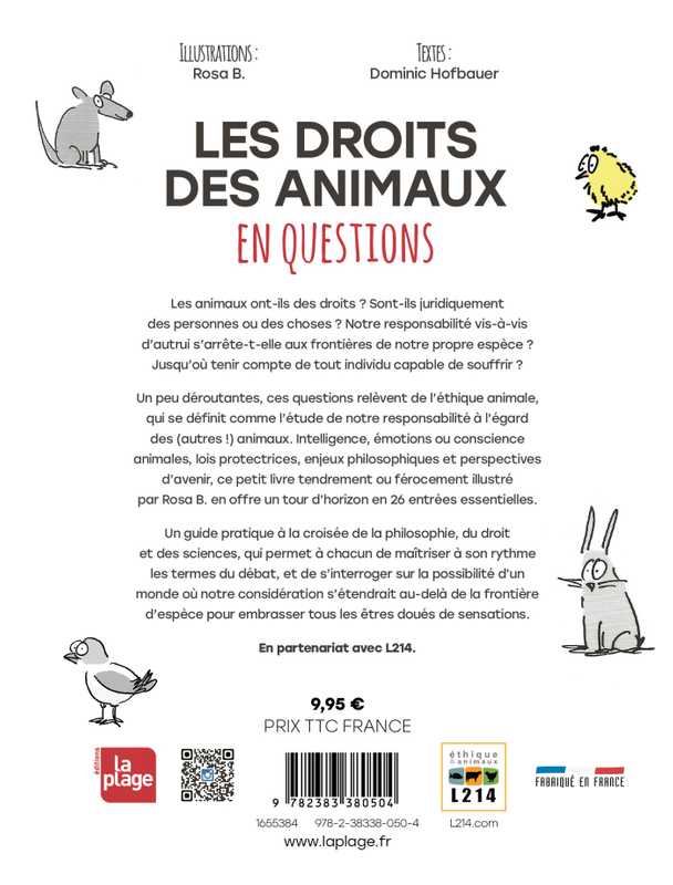 Un peu déroutantes, ces questions relèvent de l’éthique animale, qui se définit comme l’étude de notre responsabilité à l’égard des (autres !) animaux. Intelligence, émotions ou conscience animales, lois protectrices, enjeux philosophiques et perspectives d’avenir, ce petit livre tendrement ou férocement illustré par Rosa B. en offre un tour d’horizon en 26 entrées essentielles.