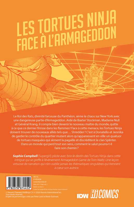 Dans Tortues Ninja Reborn Tome 6 - Armageddon Game : début de partie, la série de Sophie Campbell s'intègre au grand évènement « Armageddon Game », que nous publions sur un ensemble de trois tomes à forte pagination. Ce tome double comporte les numéros de la série régulière à suivre en parallèle du récit principal. Découvrez comment Shredder vient alerter les Tortues des terribles plans du Roi des Rats, puis comment les Tortues restées à New York vont résister aux machinations menées par Krang, Baxter Stockman et Madame Null.