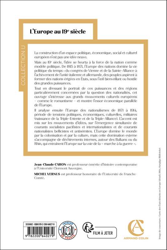 De 1815 à 1871, l’Europe des nations domine la vie politique du temps : du congrès de Vienne et de la Sainte-Alliance à l’achèvement de l’unité italienne et allemande, des peuples aspirent à former des nations érigées en États, sous l’il bienveillant ou hostile des grandes puissances. Tout en dressant le portrait de ces puissances et des régions particulièrement concernées par la question des nationalités, cet ouvrage s’intéresse aux grands mouvements culturels européens – comme le romantisme – et montre l’essor économique parallèle de l’Europe.