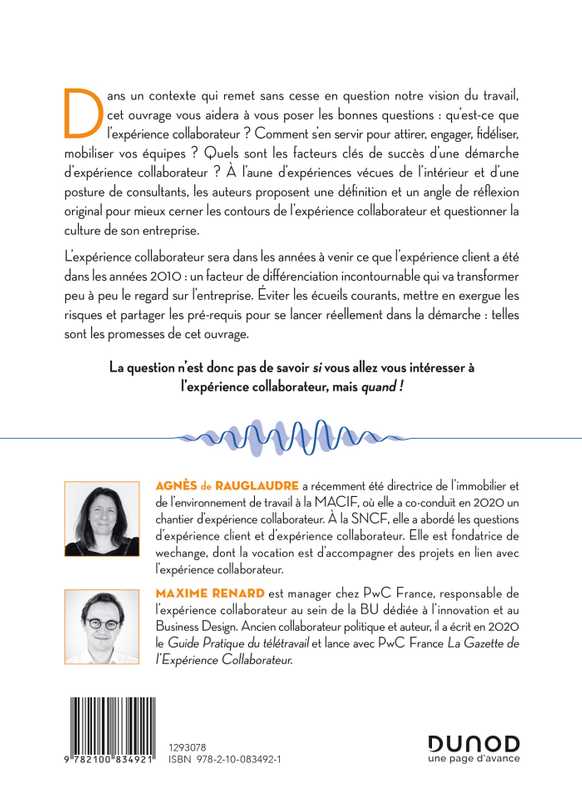 L’expérience collaborateur sera dans les années à venir ce que l’expérience client a été dans les années 2010 : un facteur de différenciation incontournable qui va transformer peu à peu le regard sur l’entreprise. Éviter les écueils courants, mettre en exergue les risques et partager les pré-requis pour se lancer réellement dans la démarche : telles sont les promesses de cet ouvrage.