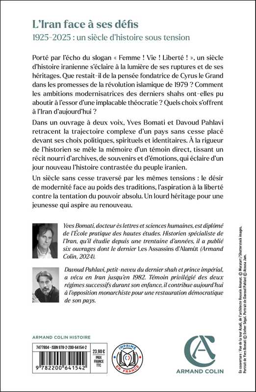 Dans un ouvrage à deux voix, Yves Bomati et Davoud Pahlavi retracent la trajectoire complexe d’un pays sans cesse placé devant ses choix politiques, spirituels et identitaires. À la rigueur de l’historien se mêle la mémoire d’un témoin direct, tissant un récit nourri d’archives, de souvenirs et d’émotions, qui éclaire d’un jour nouveau l’histoire contrastée du peuple iranien.