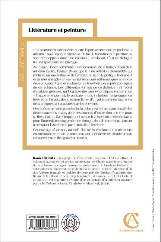 Au-delà de l’idée commune mais sommaire de la transposition d’un art dans l’autre, l’auteur développe ici une réflexion d’ensemble qui mobilise un savoir double de l’art pictural et de la pratique littéraire. Il éclaire les multiples croisements historiques et thématiques entre ces deux arts, autant que les soubassements esthétiques et philosophiques de cet échange. Les différentes formes de ce dialogue font l’objet d’analyses précises, qu’il s’agisse des genres pratiqués en commun – l’histoire, le portrait, le paysage –, des inclusions réciproques du texte et de l’image, des créations libres d’un art à partir de l’autre, ou de la critique d’art pratiquée par les écrivains.