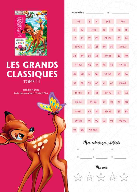 - Un catalogue complet des livres de coloriages mystères Disney : les Grands classiques, mais également les autres titres en grand format, les grands blocs mystères et les grands carrés mystères.