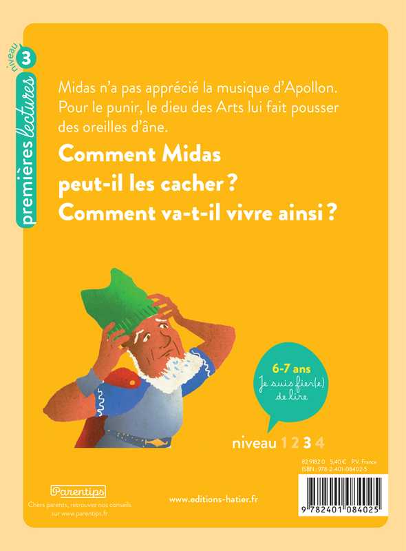 Les lecteurs de 6-7 ans découvrent ici un important épisode de la mythologie grecque, celui où le bienheureux roi Midas se voit pousser des oreilles d’âne et cherche à les cacher.