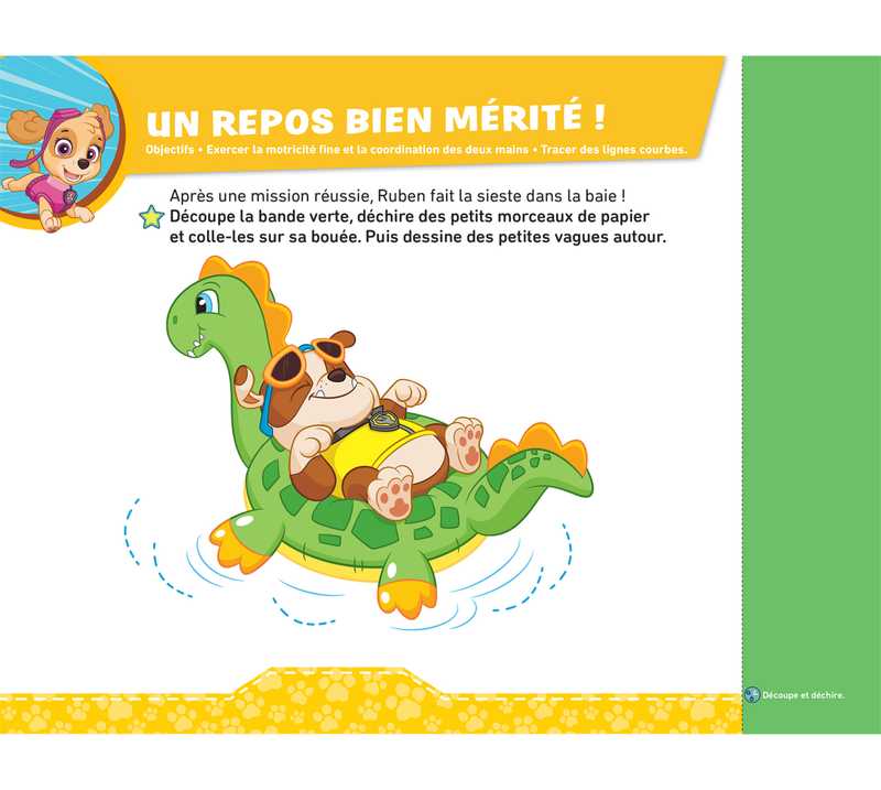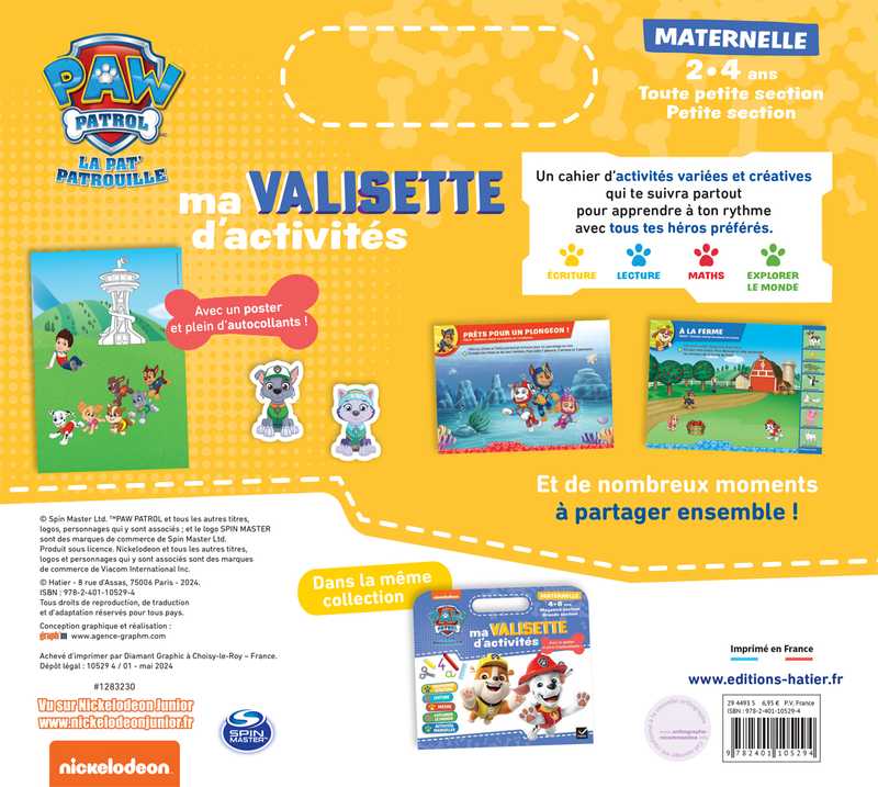 Retrouvez la Pat’ Patrouille dans un cahier en forme de valisette, pratique à emporter partout avec soi, avec plein d’activités ludiques et variées pour découvrir tout le programme de Toute Petite et Petite Section !