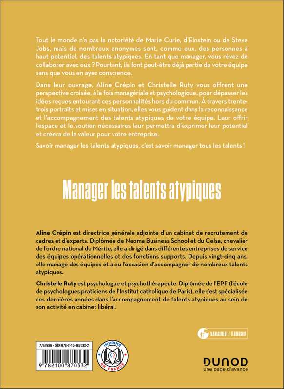 Dans leur ouvrage, Aline Crépin et Christelle Ruty vous offrent une perspective croisée, à la fois managériale et psychologique, pour dépasser les idées reçues entourant ces personnalités hors du commun. À travers trente-trois portraits et mises en situation, elles vous guident dans la reconnaissance et l’accompagnement des talents atypiques de votre équipe. Leur offrir l’espace et le soutien nécessaires leur permettra d’exprimer leur potentiel et créera de la valeur pour votre entreprise.