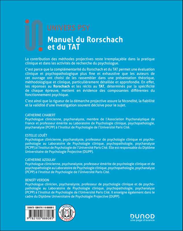 C’est parce que la complémentarité du Rorschach et du TAT permet une évaluation clinique et psychopathologique plus fine et exhaustive que les auteurs de cet ouvrage ont choisi de les rassembler dans une présentation théorique, méthodologique et clinique, particulièrement détaillée et approfondie. En effet, les réponses au Rorschach et les récits au TAT, déterminés par la spécificité de chaque épreuve, mettent en évidence des composantes différentes du fonctionnement psychique.