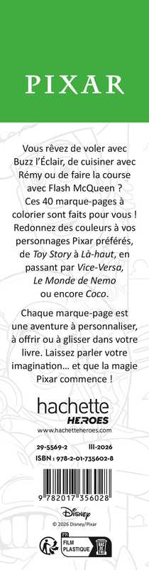 Redonnez des couleurs à vos personnages Pixar préférés, de Toy Story à Là-haut, en passant par Vice-Versa, Le Monde de Nemo ou encore Coco. Chaque marque page est une aventure à personnaliser, à offrir ou à glisser dans votre livre. Laissez parler votre imagination… et que la magie Pixar commence !