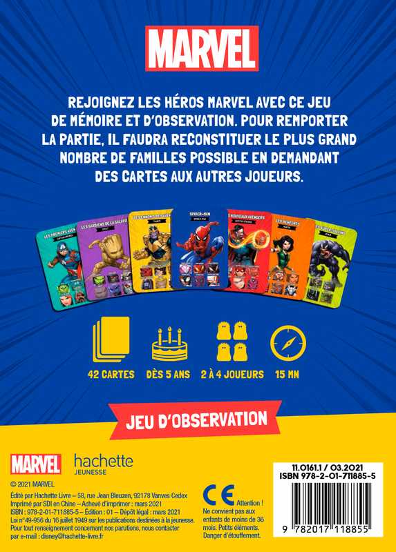 Le jeu : Un jeu de sept familles dans lequel il faut reconstituer tous les groupes de personnages Marvel, qu'ils soient super-héros ou vilains !