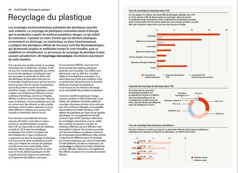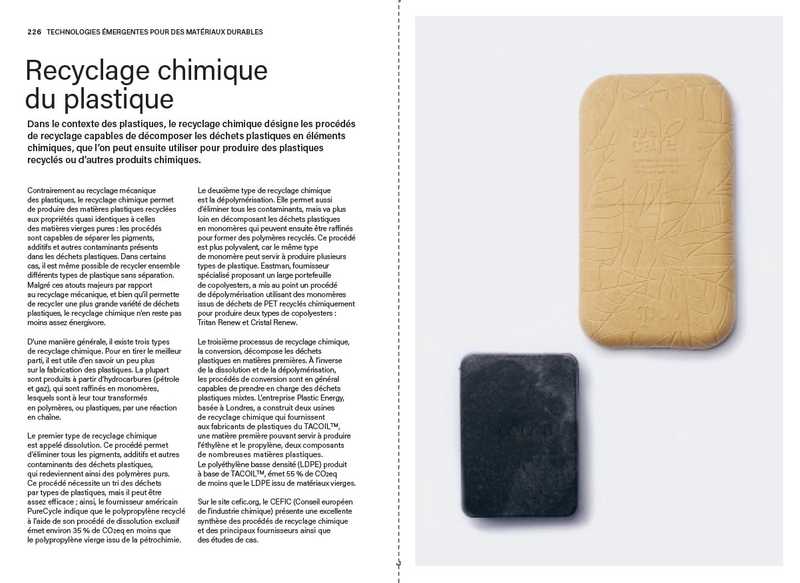 Après avoir présenté les technologies de production et de recyclage de chaque type de matériau, de nombreuses fiches techniques détaillent les caractéristiques et l’impact environnemental des principaux matériaux éco-responsables.
