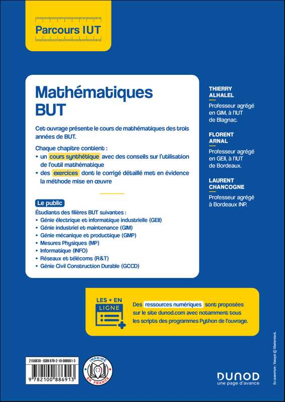 Cet ouvrage de la collection "Parcours IUT" présente le cours de mathématiques des trois années de BUT des filières GEII, GIM, GMP, Mesures physiques, Informatique, Réseaux et télécommunications. Les rappels de cours sont appuyés par de nombreux exercices corrigés. Le cours est structuré en courtes sections. Chaque section contient :